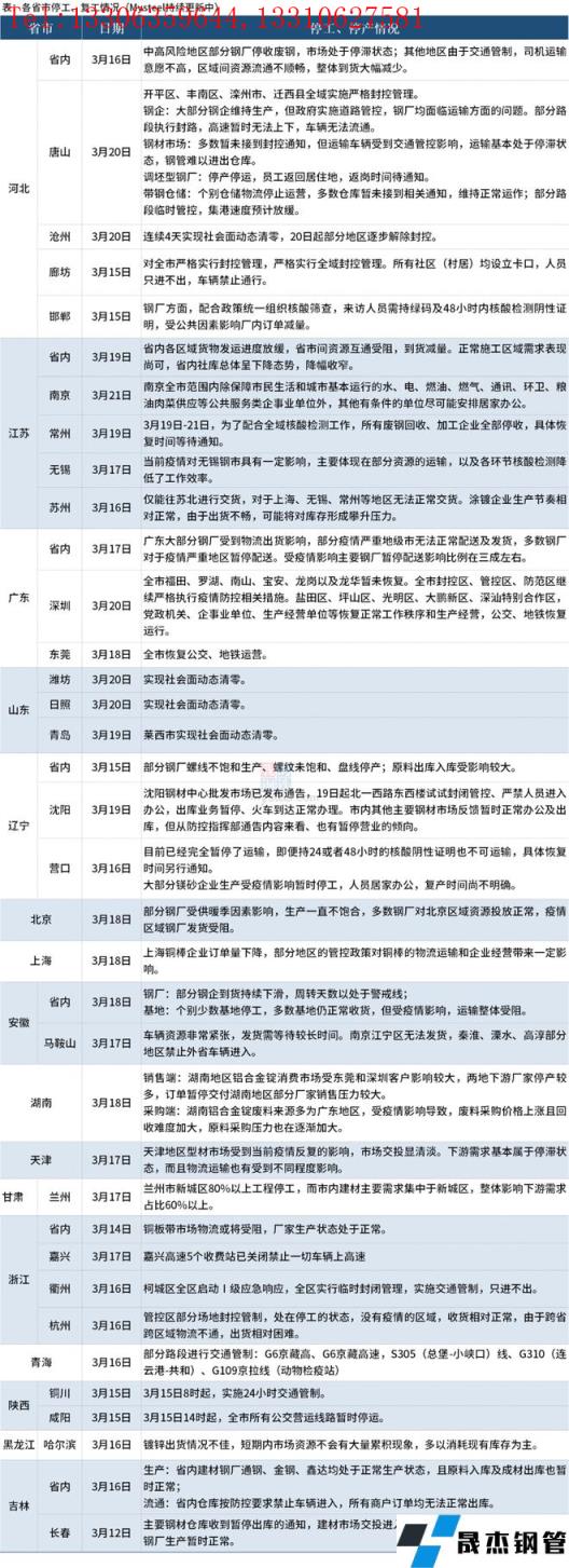 好像是一夜之間,疫情再次卷土重來(lái)。截至3月21日,16個(gè)省份停工復(fù)工情況見(jiàn)下表。其中,3月21日,南京全市范圍內(nèi)除保障市民生活和城市基本運(yùn)行的水、電、燃油、燃?xì)狻⑼ㄐ拧h(huán)衛(wèi)、糧油肉菜供應(yīng)等公共服務(wù)類(lèi)企事業(yè)單位外,其他有條件的單位盡可能安排居家辦公。3月20日,唐山開(kāi)平區(qū)、豐南區(qū)、灤州市、遷西縣全域?qū)嵤﹪?yán)格封控管理;大部分鋼企維持生產(chǎn),但政府實(shí)施道路管控,精密管廠家均面臨運(yùn)輸方面的問(wèn)題。深圳全市福田、羅湖、南山、寶安、龍崗以及龍華暫未恢復(fù),全市封控區(qū)、管控區(qū)、防范區(qū)繼續(xù)嚴(yán)格執(zhí)行疫情防控相關(guān)措施。山東濰坊、日照、青島萊西市實(shí)現(xiàn)社會(huì)面動(dòng)態(tài)清零。河北滄州連續(xù)4天實(shí)現(xiàn)社會(huì)面動(dòng)態(tài)清零,3月20日起部分地區(qū)逐步解除封控。